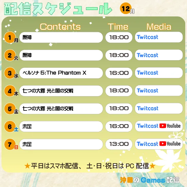 配信/投稿スケジュール 2025.11.30 Update.